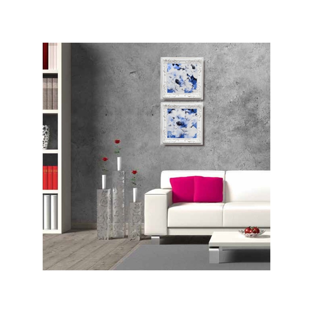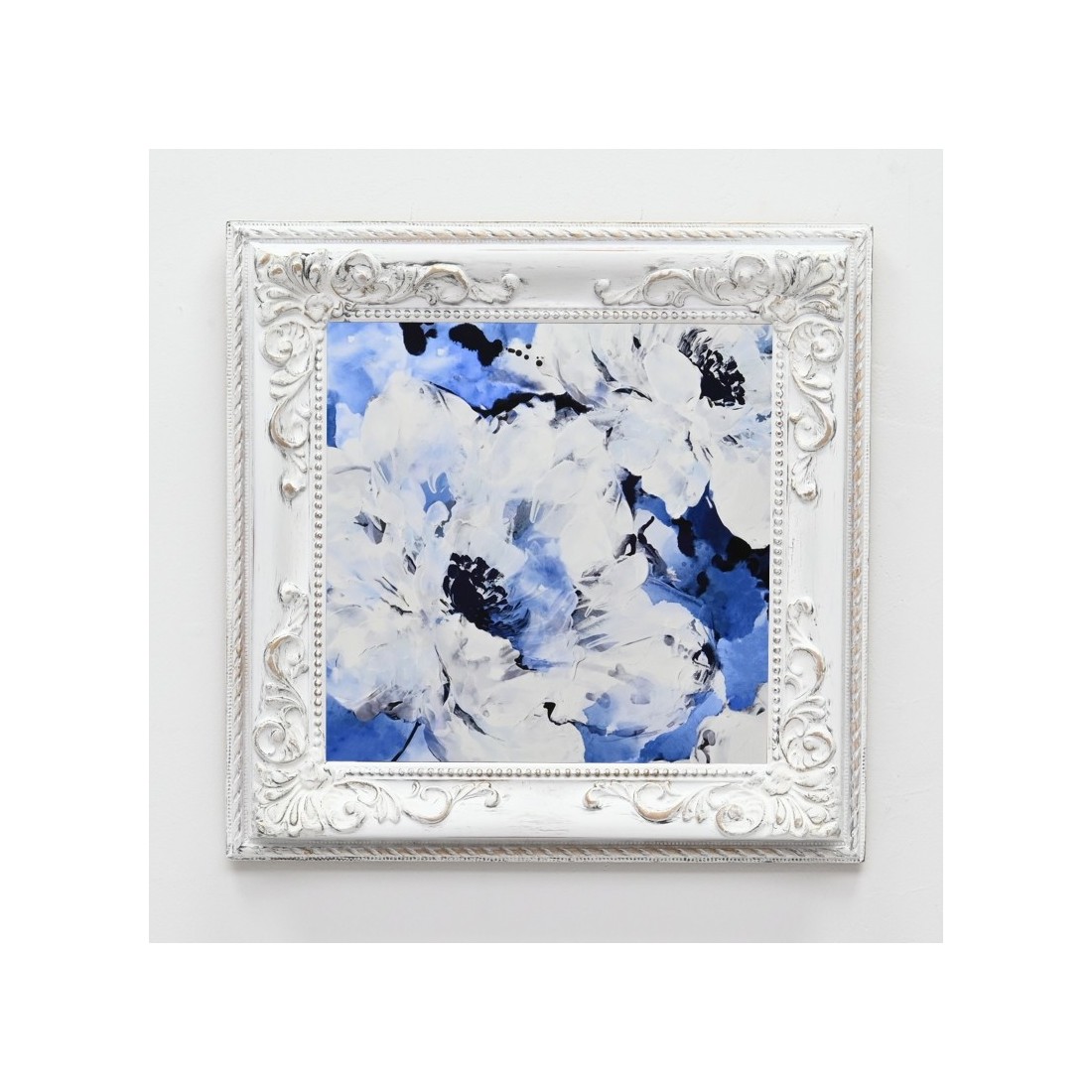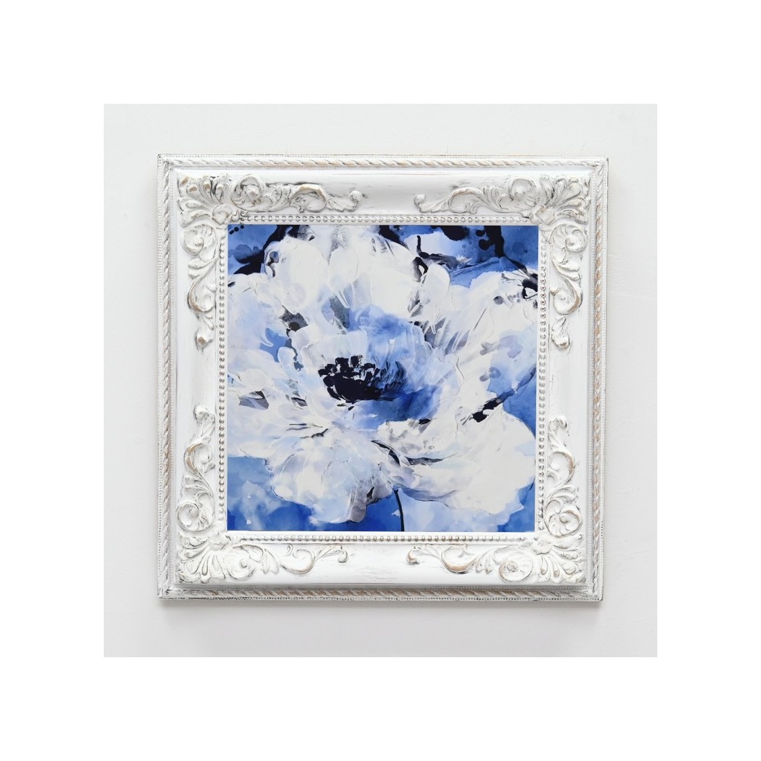 Madera en blanco decapé y plata. Tapizado en Azul y capitoné.